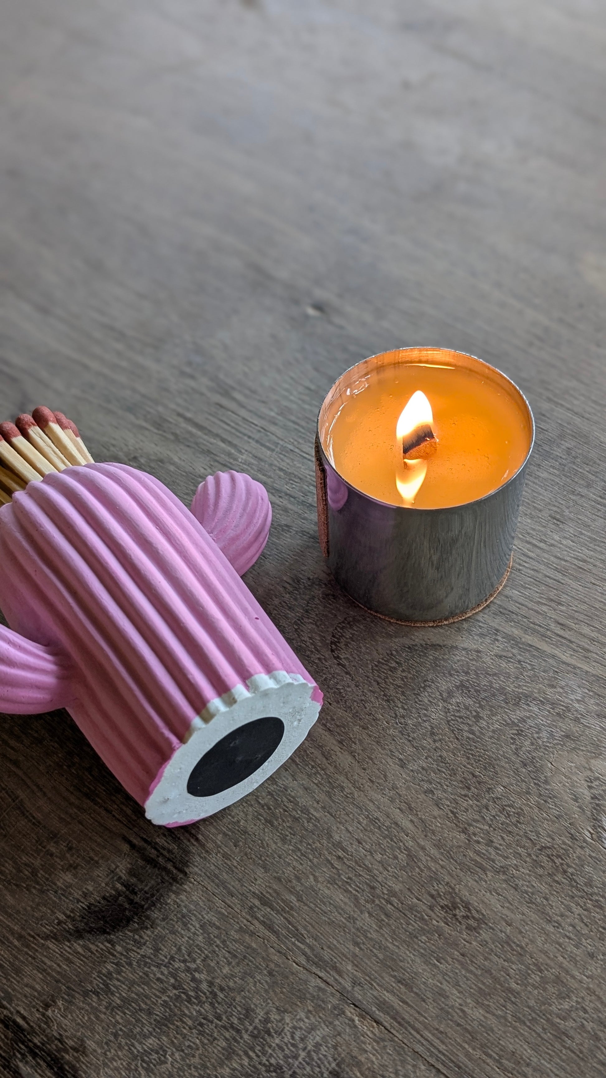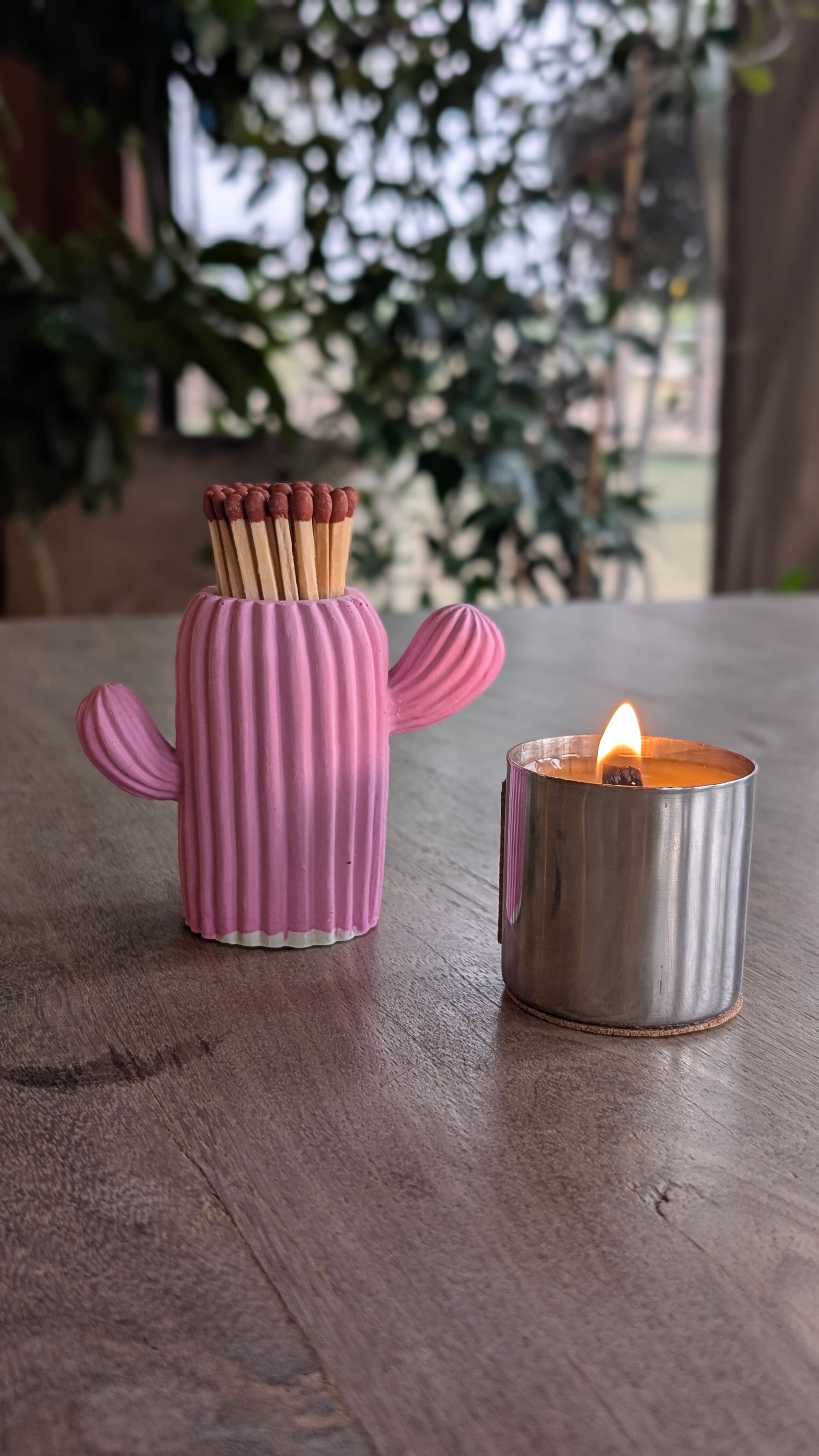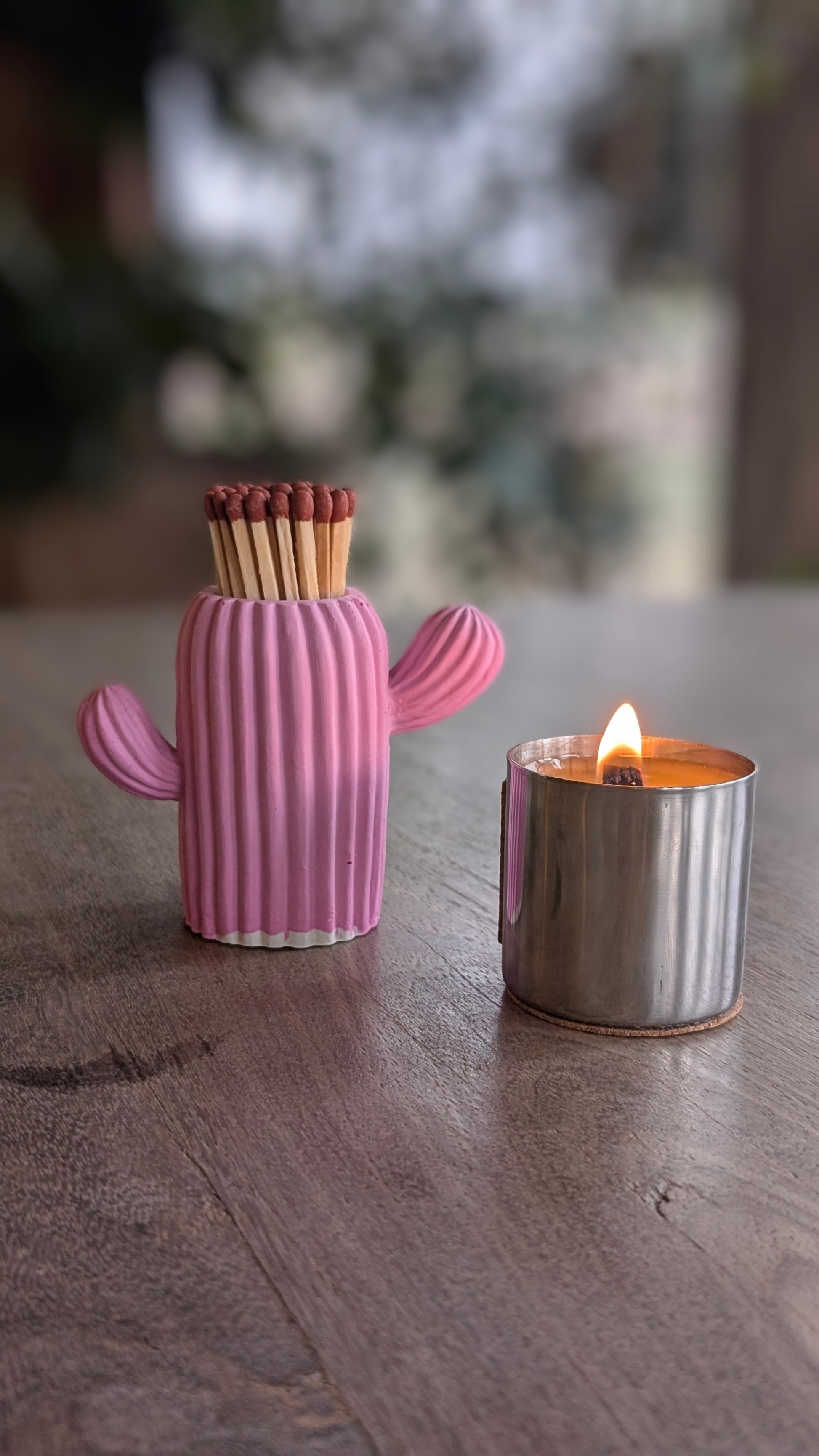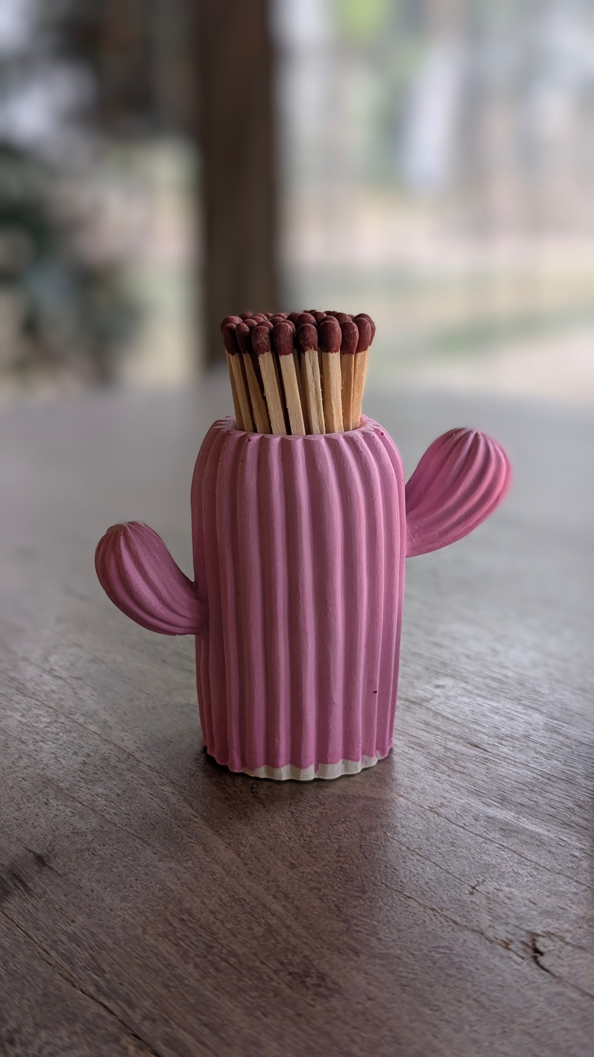 This beautiful and completely handmade pink coloured cactus Match pot jar, made from eco-friendly jesmonite, sealed to be waterproof and with a match striker on the bottom.