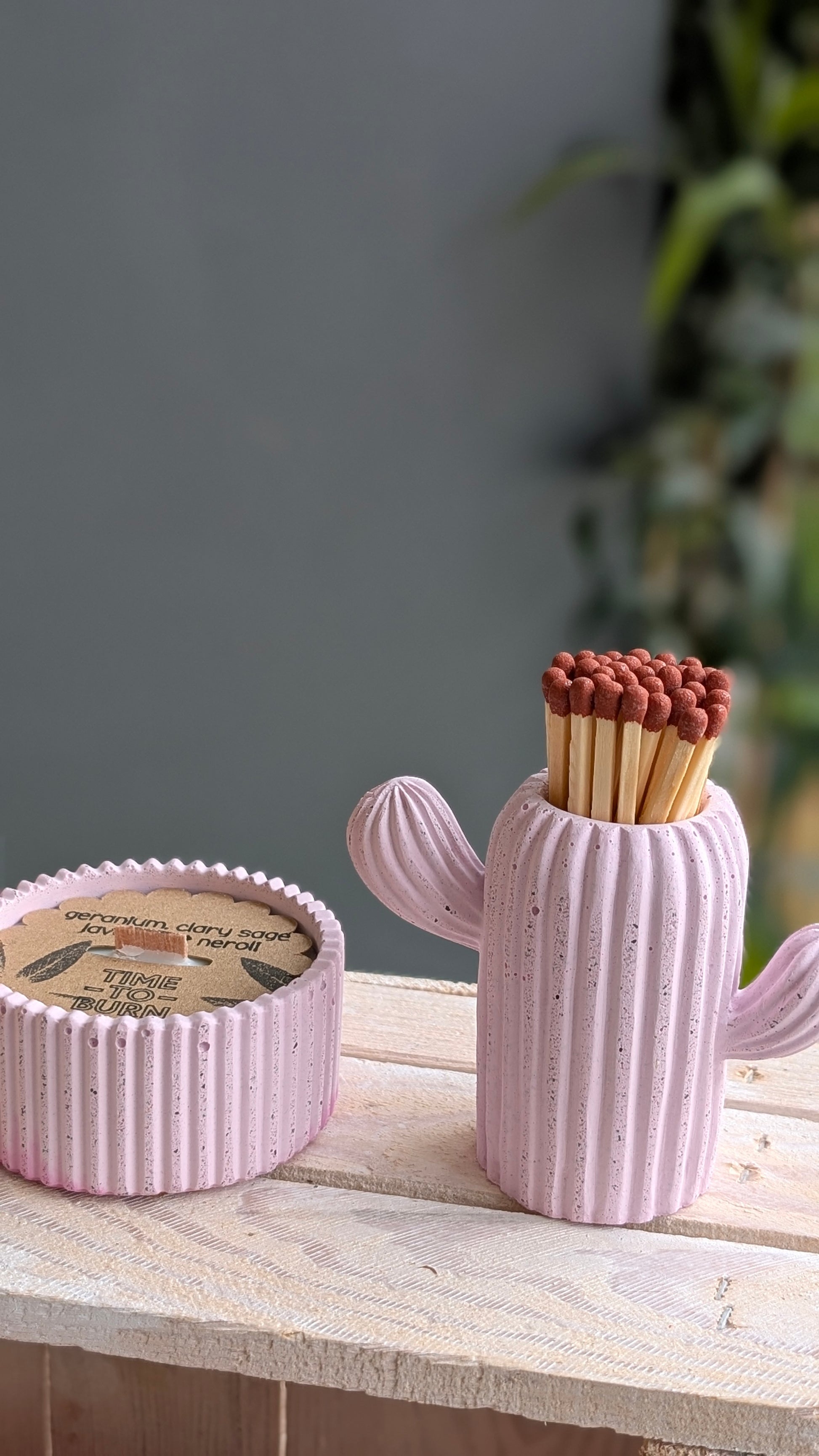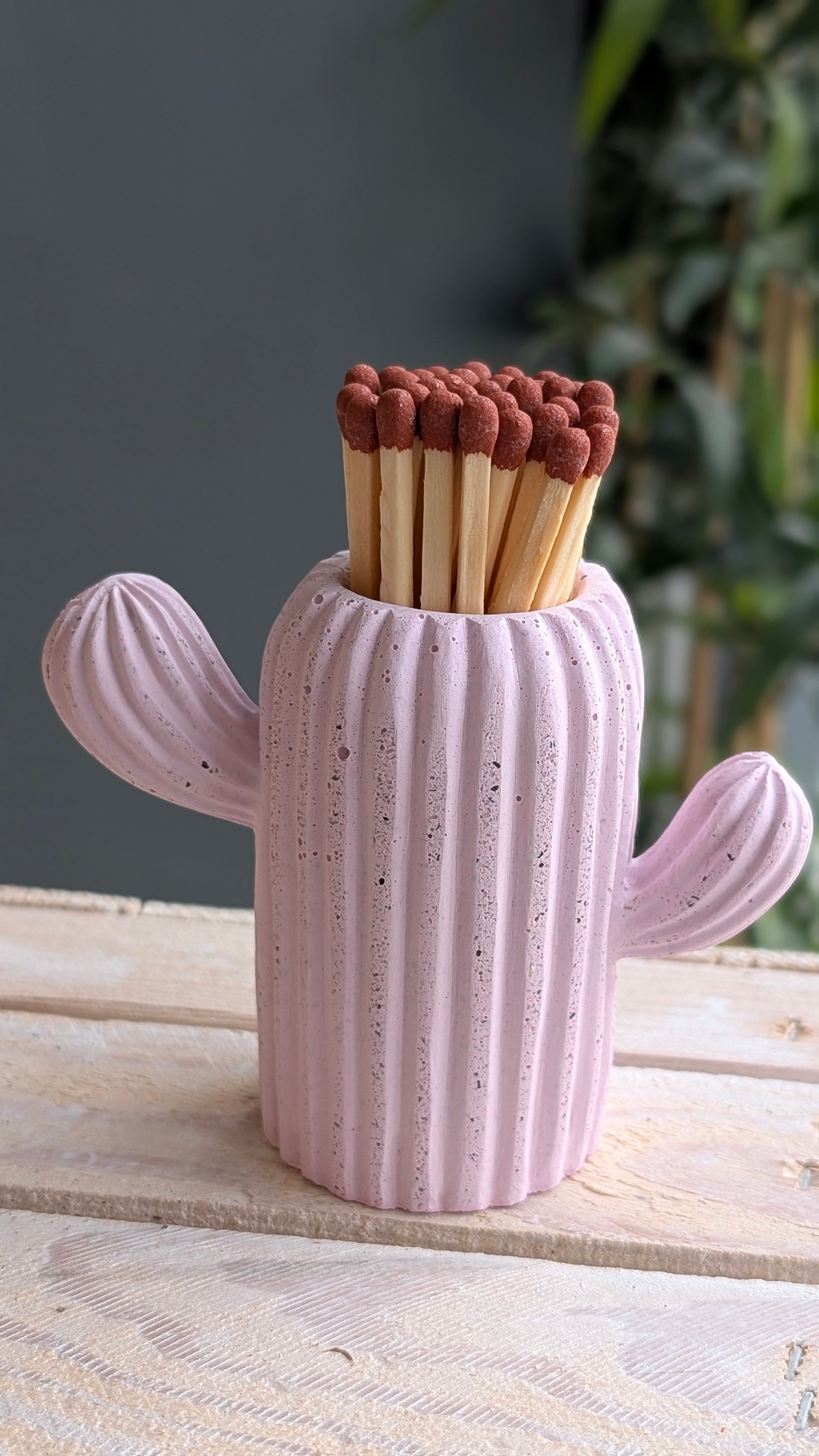 This beautiful and completely handmade pink coloured cactus Match pot jar, made from eco-friendly jesmonite, sealed to be waterproof and with a match striker on the bottom. It comes in a cute brown box decorated with cactai.