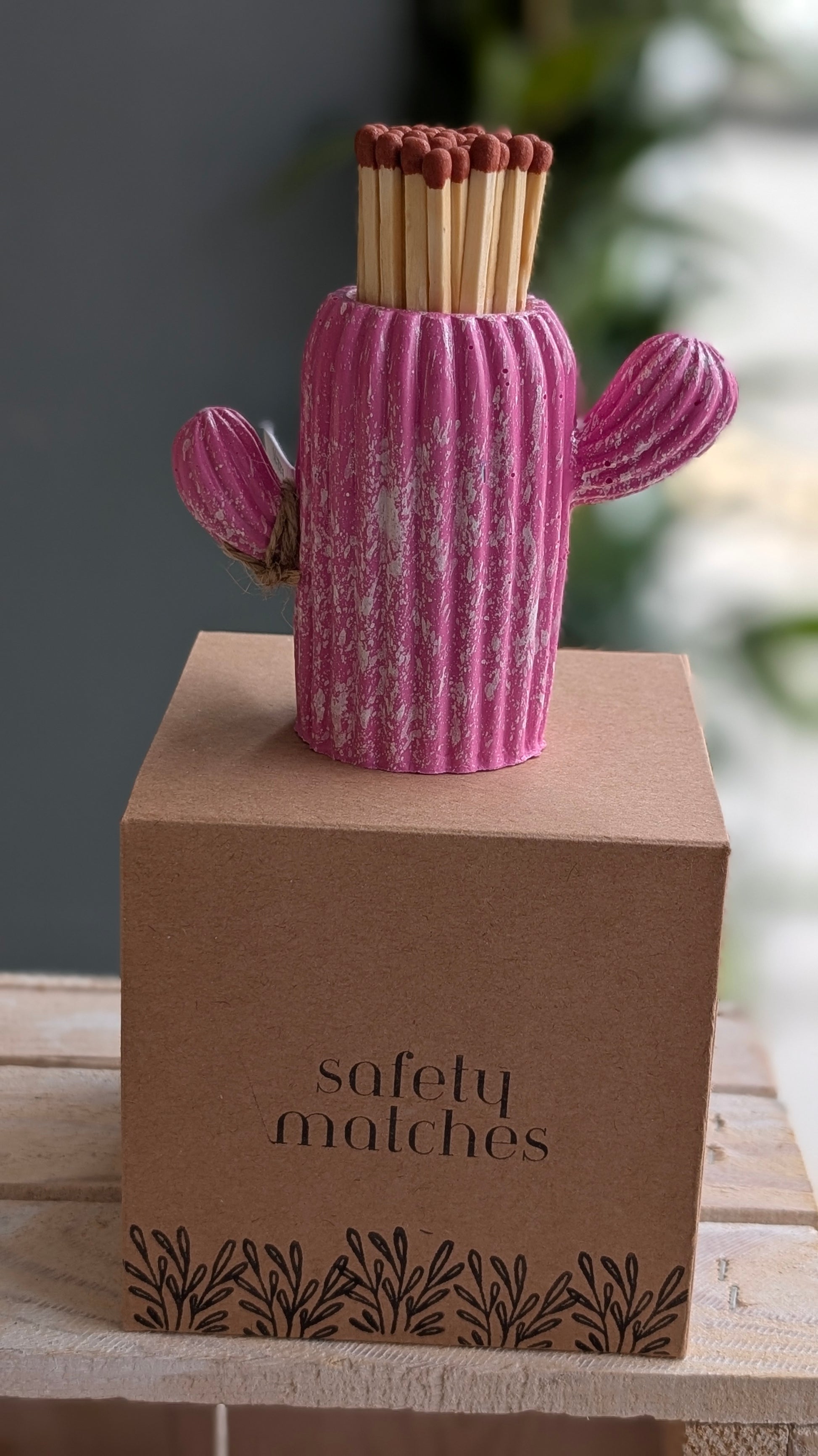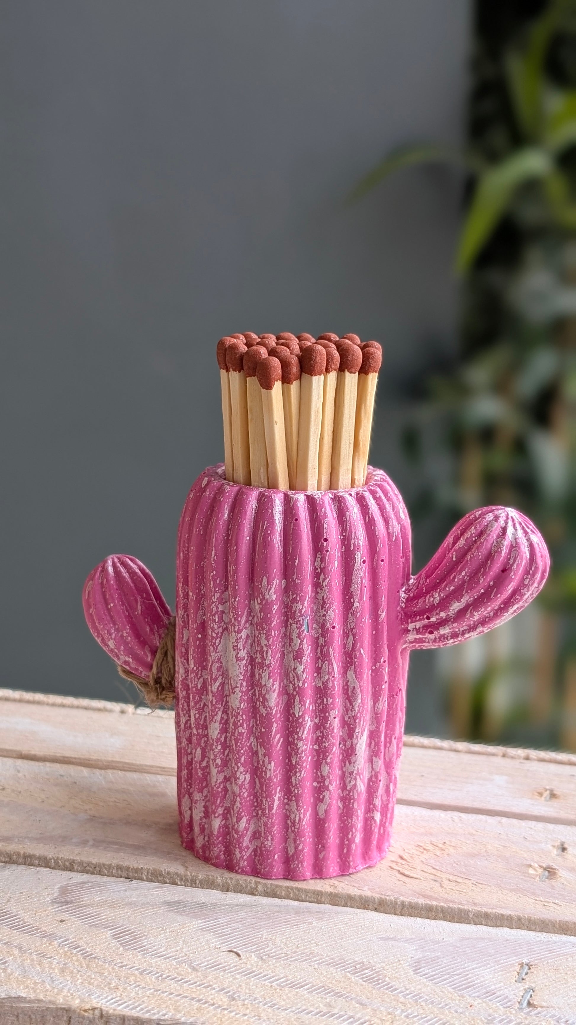 This beautiful and completely handmade pink and white marbled coloured cactus Match pot jar, made from eco-friendly jesmonite, sealed to be waterproof and with a match striker on the bottom. It comes in a cute brown box decorated with cactai.