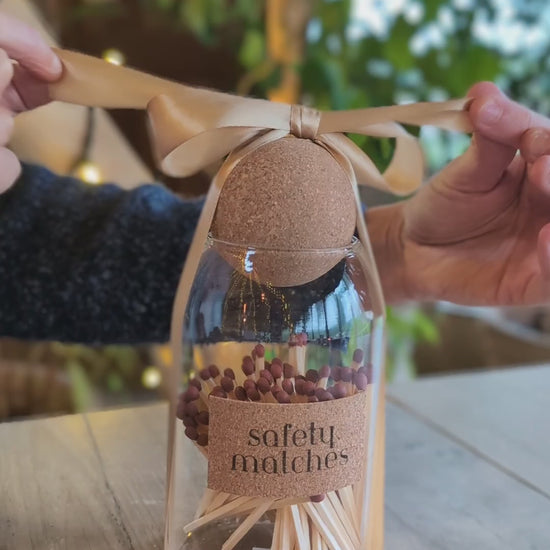 This cute and unique handmade glass Match jar with cork ball lid contains 90 long matches and has a cute gold ribbon round the matches and on top of the ball - the perfect gift!