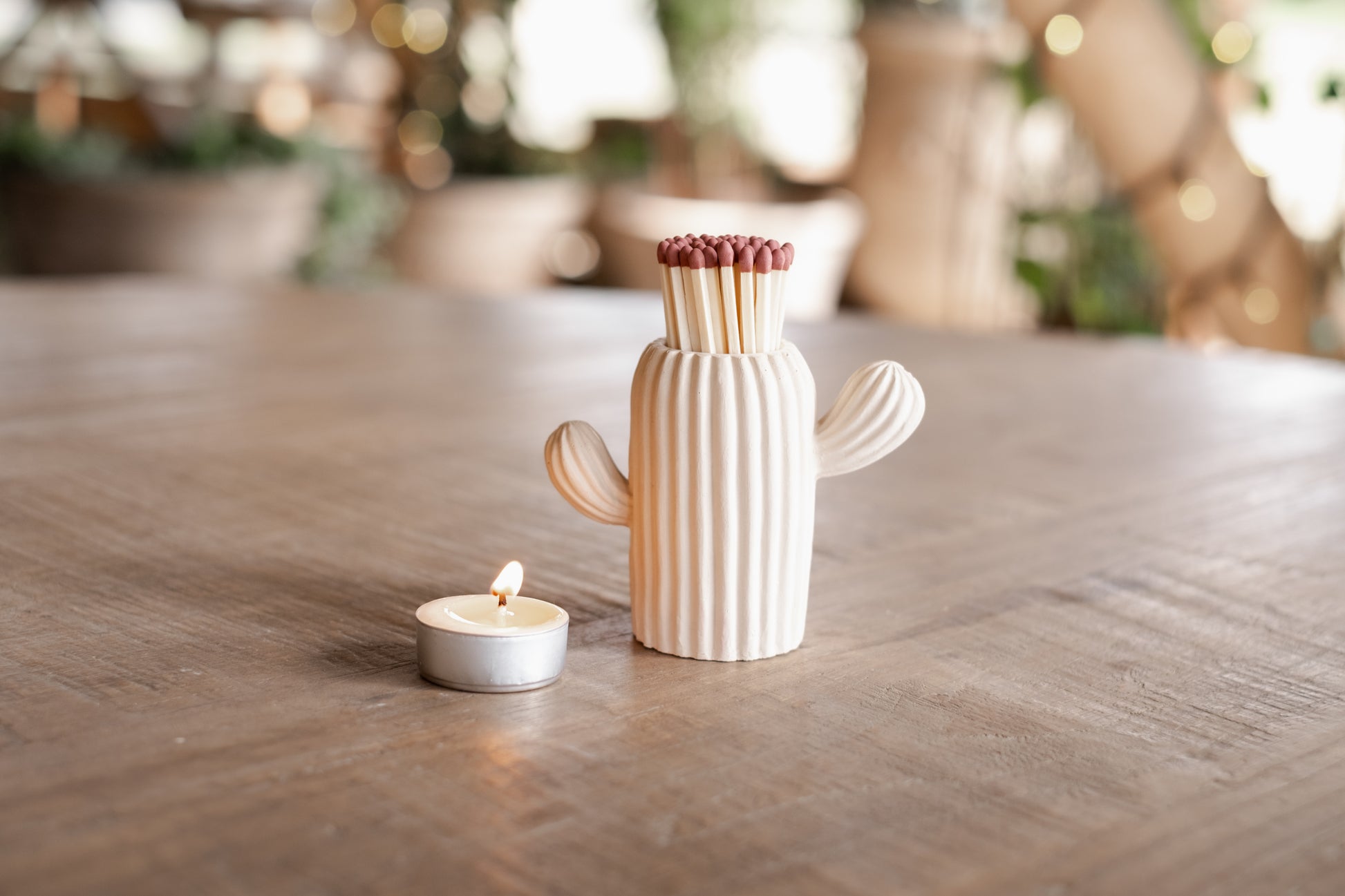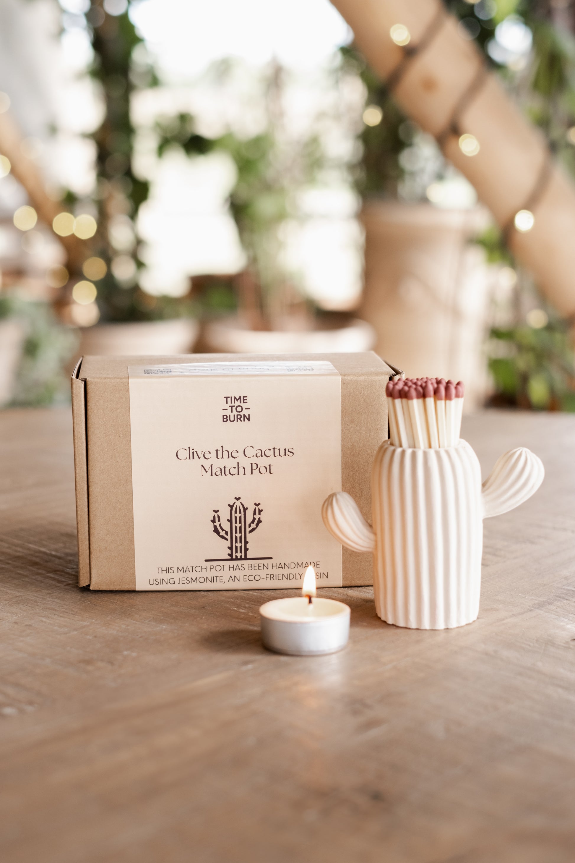 A completely handmade stone coloured cactus Match pot jar made from eco-friendly jesmonite, sealed to be waterproof and with a match striker on the bottom.