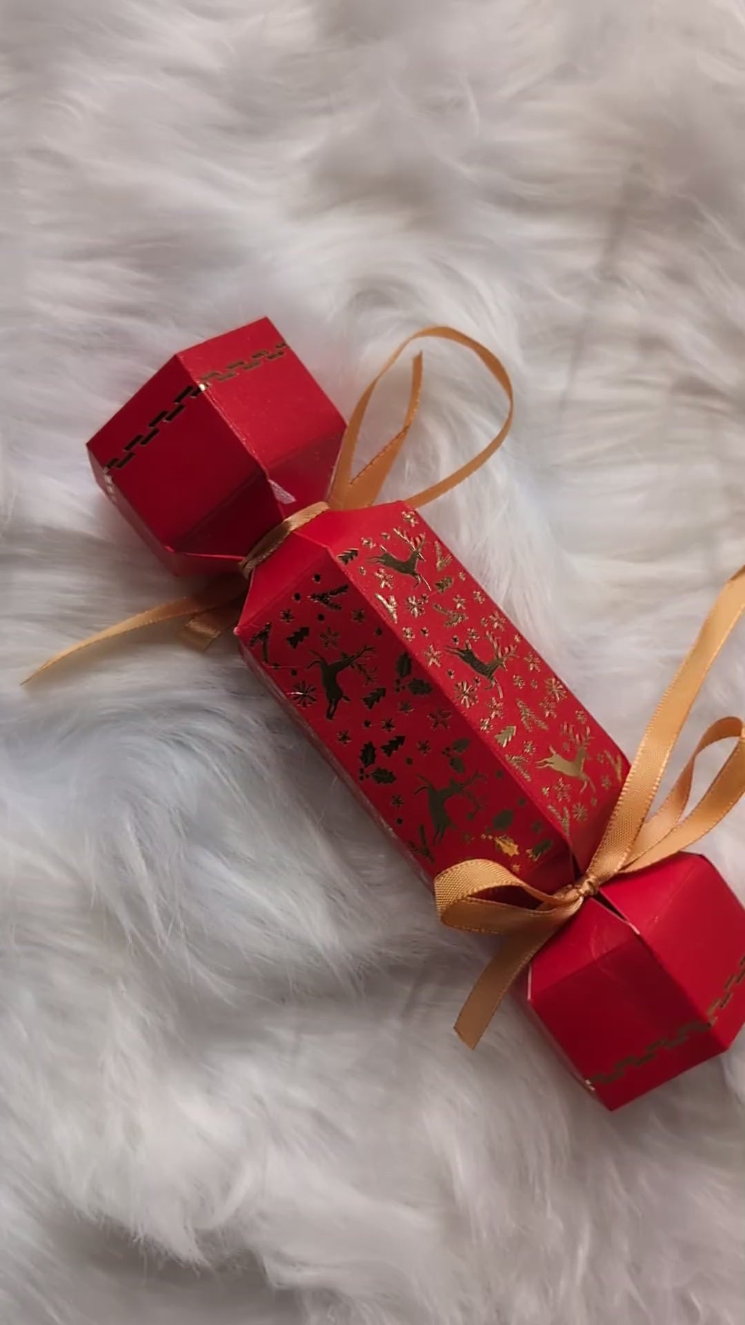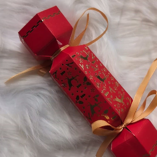 A beautiful red and gold Reindeer Cracker filled with an organza bag of 5 handmade Mulled Cider Tealights