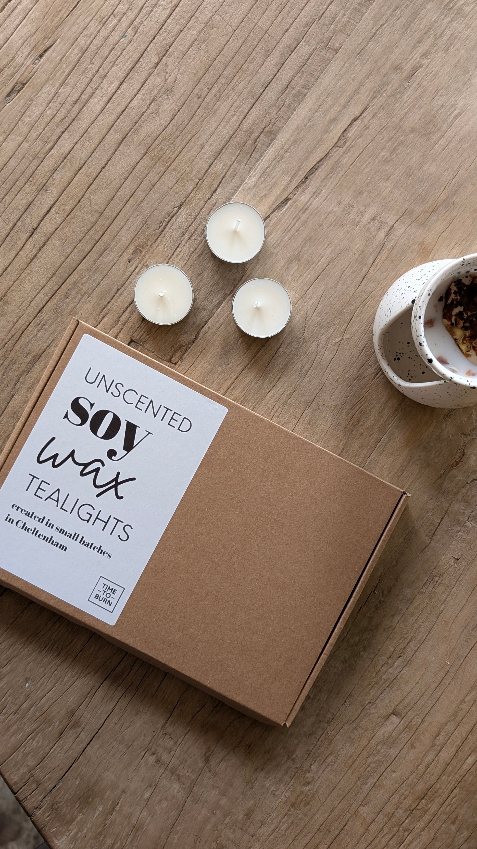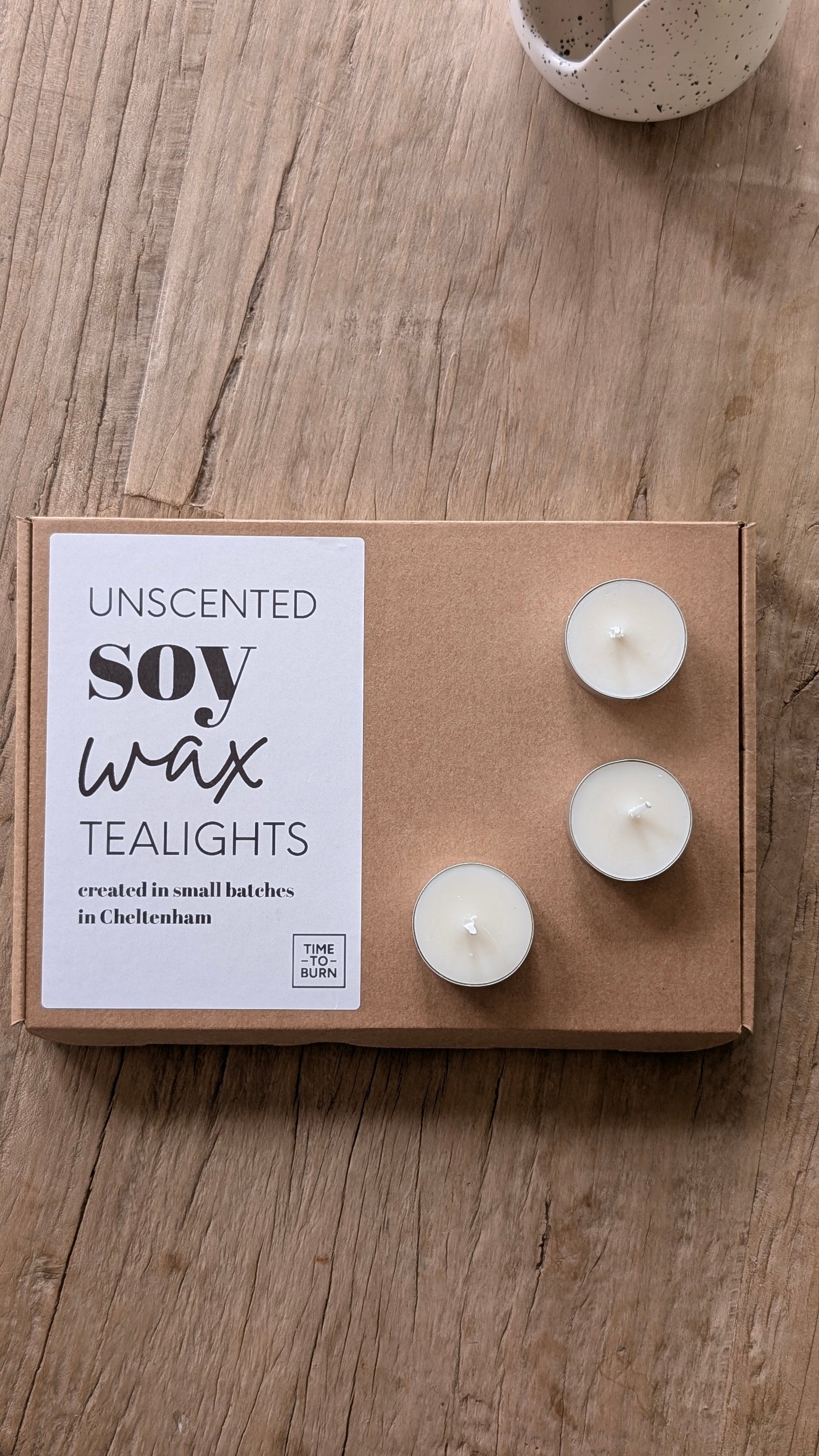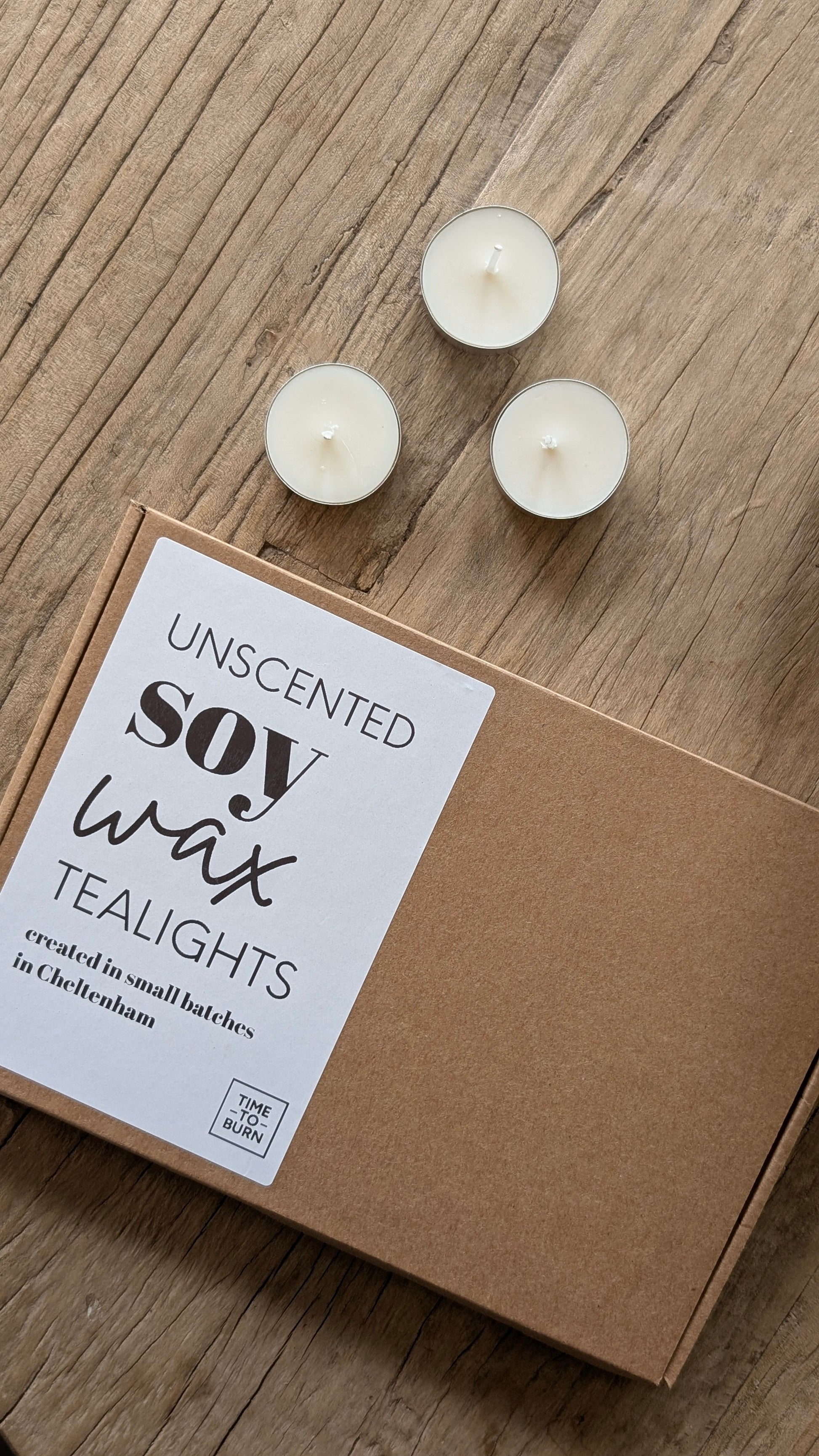 Our Unscented Tealights have been made using only soy wax and a cotton wicks, poured in aluminium recyclable cups. Simple!