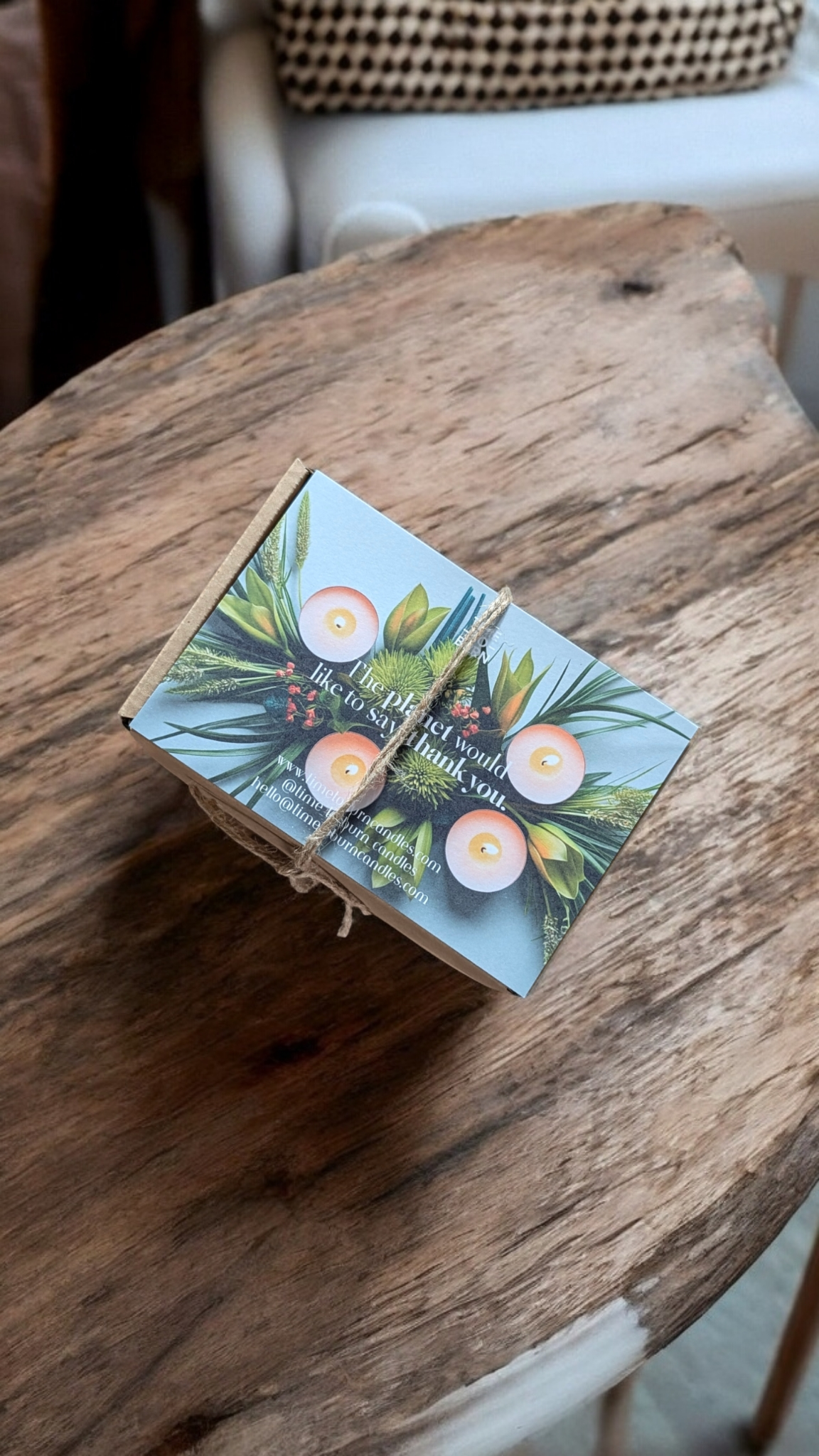 This beautiful and completely handmade yellow and black marbled coloured cactus Match pot jar, made from eco-friendly jesmonite, sealed to be waterproof and with a match striker on the bottom. It comes in a cute brown box decorated with cactai.